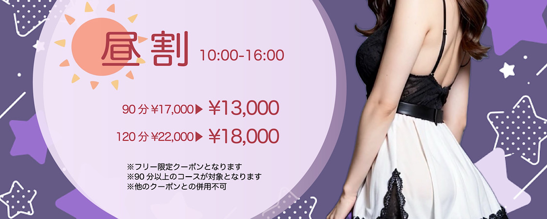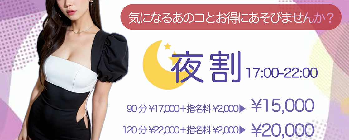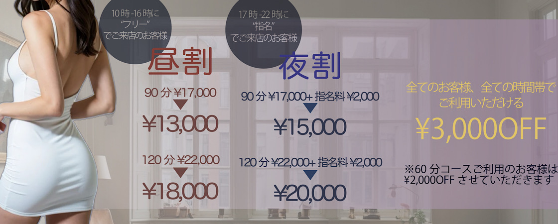 17時~22時まで90分以上のコースが指名料無料+コース料金2000円の合計4000円割引♡